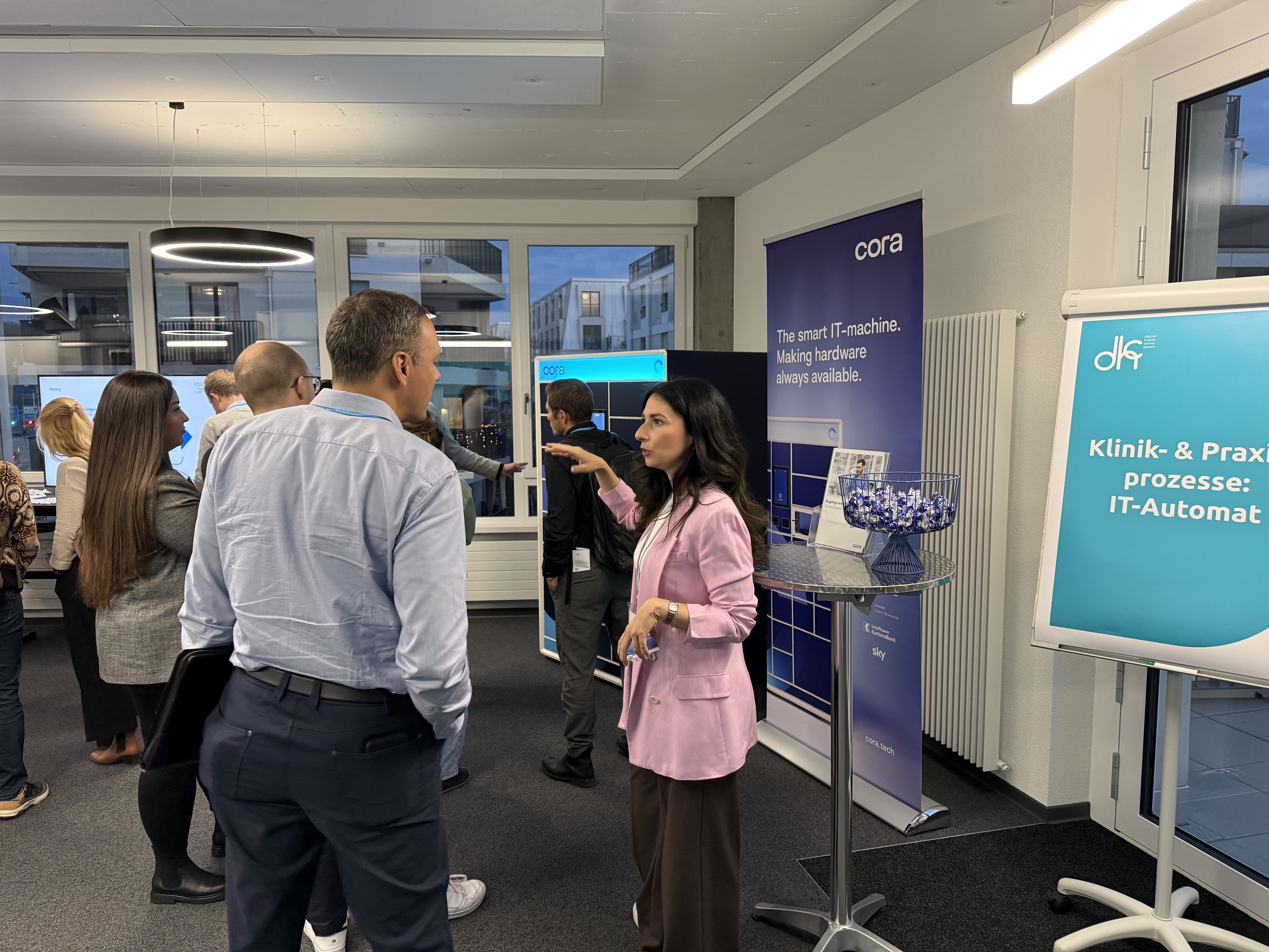 An unserem Stand im «Markt der Möglichkeiten» konnten Besucher:innen anhand von Livedemos erleben, wie cora in Gesundheitsorganisationen angewendet werden kann. Wir konnten damit aufzeigen, wie cora das Hardware Management via Automation & Self Service übernehmen kann. Es war für uns bestärkend zu sehen, auf welch positive Resonanz die Idee von cora insbesondere im Kontext von Spitälern stösst. Bei grossen Krankenhäusern wie unter anderem dem Kantonsspital St. Gallen, dem Kantonsspital Aarau (KSA) sowie der Schwarzwald-Baar Klinik sind bereits cora Automaten erfolgreich im Einsatz.